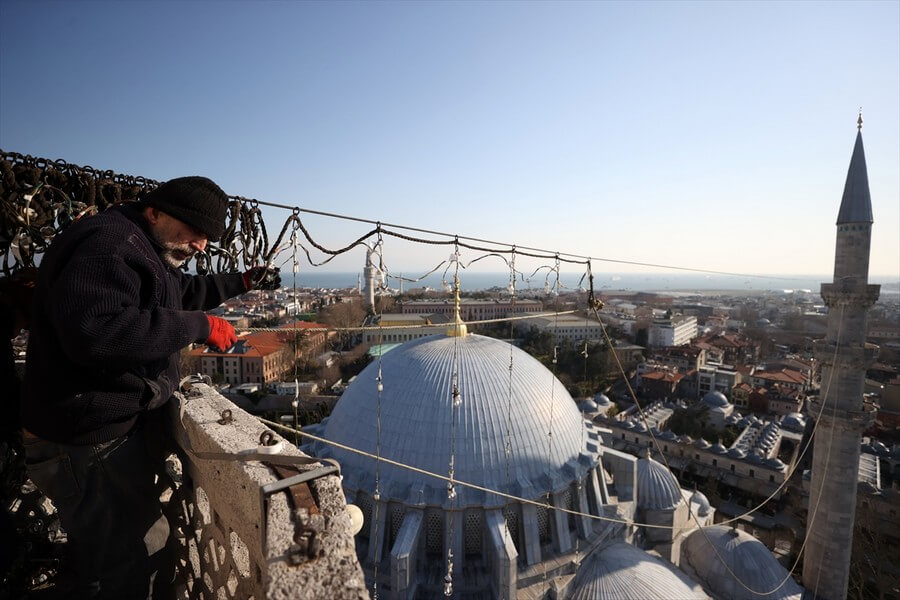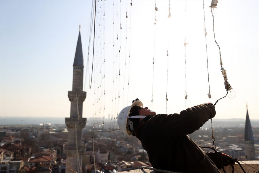 Süleymaniye Camii'nde Ramazan boyunca farklı yazıların yer alacağı mahyanın iki minare arasına yerleştirilmesi için çalışma yapıldı.