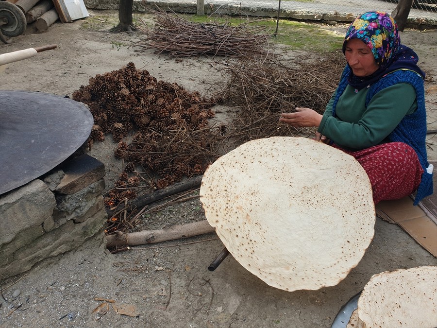 Yufka ekmek yapımı için evlerinin bahçesinde toplanan hanımlar, hamur yoğurarak işe başlıyor.
