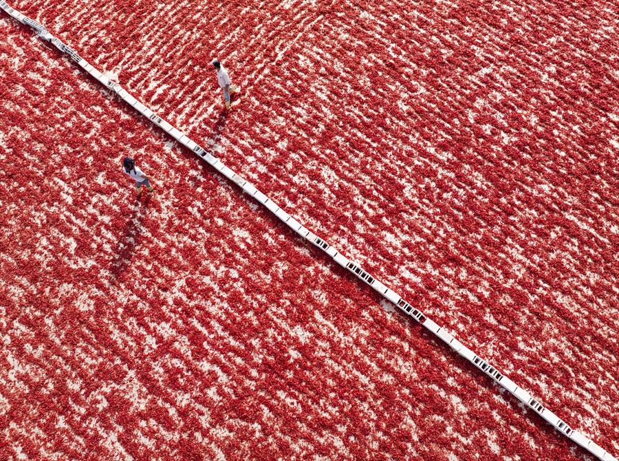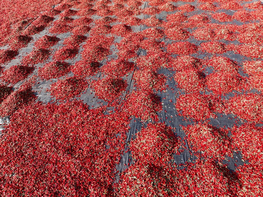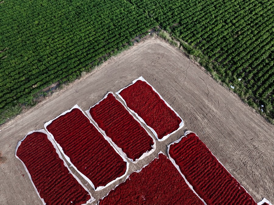 Yoğun emek isteyen süreçte çiftçiler sabahın ilk saatlerinde çalışmaya başlarken kurutma alanları kırmızıya bürünüyor.